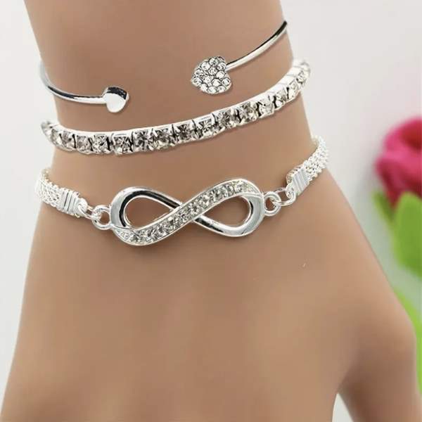 Šajā izsmalcinātajā komplektā ir spīdīgas, ar mirdzošiem kristāliem rotātas bezgalības simbolu ķēdītes sudraba krāsā, kas lieliski papildinās jūsu rotaslietu kolekciju. 💫💎